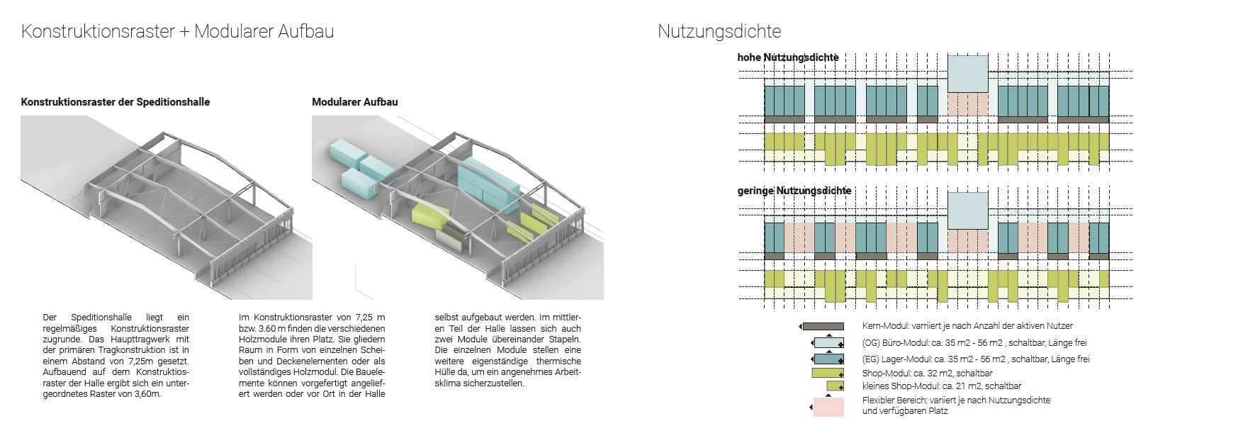 Der Speditionshalle liegt ein regelmäßiges Konstruktionsraster zugrunde. Für die übersichtliche Strukturierung der Halle orientieren sich die einzelnen Module im Entwurf des Teams BreaKit am schottenartigen Konstruktionsraster der Halle (7,25m Pfeilerabstand) aus. Es wurden deshalb 3,60m breite Module für eine ein- und zweigeschossigige Nutzung entworfen, um ebenfalls den vertikalen Raum nutzbar zu machen. Vorgeschlagen wird zudem die Verbindung der oberen Geschosse über eine Brücke. Diese bildet eine offene Empore und sorgt für die Erschließung der oberen Geschosse im Ost-West Verlauf der Halle (Team BreaKit, S. 9, 11).