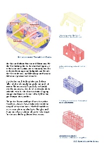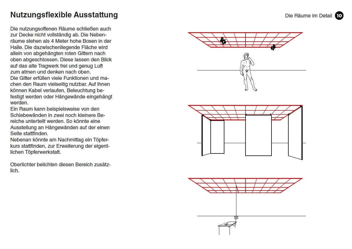 - Räumliche Aufteilung orientiert sich am schottenartigen Konstruktionsraster der Halle (Dachschotten); Unterteilung des Rasters in Primärstruktur (Tragwerk), Sekundärstruktur (Innenausbau + Wände) und Tertiärstruktur (Inneneinrichtung)