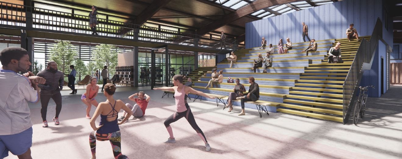 Bezugnehmend auf das Blaupausen-Konzept des Team BreaKit empfehlen wir eine offene Fläche mit Tribüne als ein zentrales Forum innerhalb der Halle. Der Entwurf des Team BreaKit schafft mit einfachen Mitteln einen multifunktionalen und kommunikativen Raum. Die stufenartige Gestaltung um die mittige Freifläche bietet vielzähligen Nutzungsmöglichkeiten Platz: Von dauerhaften Sitzgelegenheiten und sportlichen Aktivitäten bis hin zu Aufführungen und Veranstaltungen. Die zentrale Tribüne bietet eine Fläche für gemeinsame Aktivitäten sowie die Erschließung eines Veranstaltungsbereiches mit erhöhter Zuschauerzahl für Utopiastadt. Die Vermietung der Location für externe Events bietet zudem eine weitere Einnahmequelle zum Unterhalt der Halle (s. Team BreaKit).