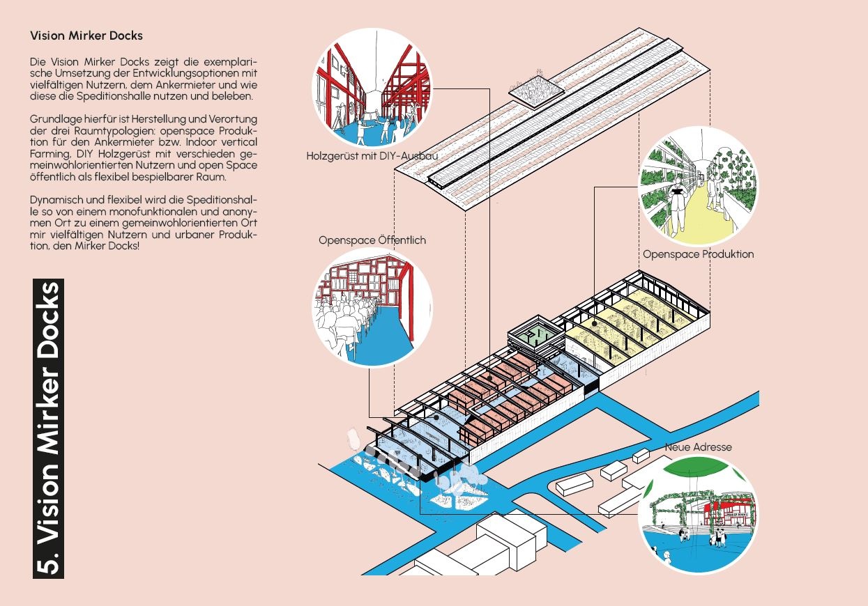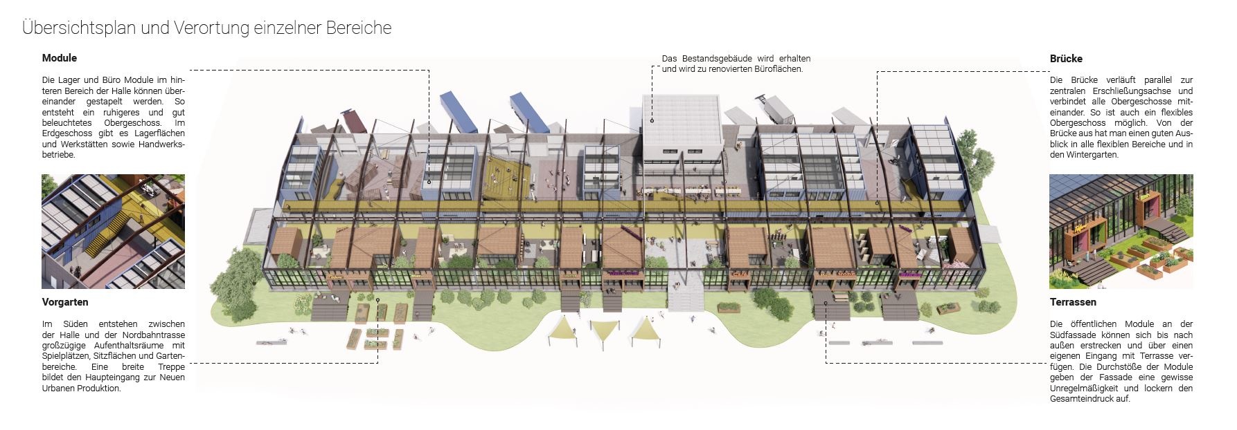 In späteren Entwicklungsphasen kann der konventionelle Ankermieter durch einen zukunftsfähigeren urbanen Produktionsakteur ersetzt werden. Das Team Pesto schlägt beispielsweise "eine urbane Indoor-Farm mit vertikalen und künstlich beleuchteten Beeten" vor.