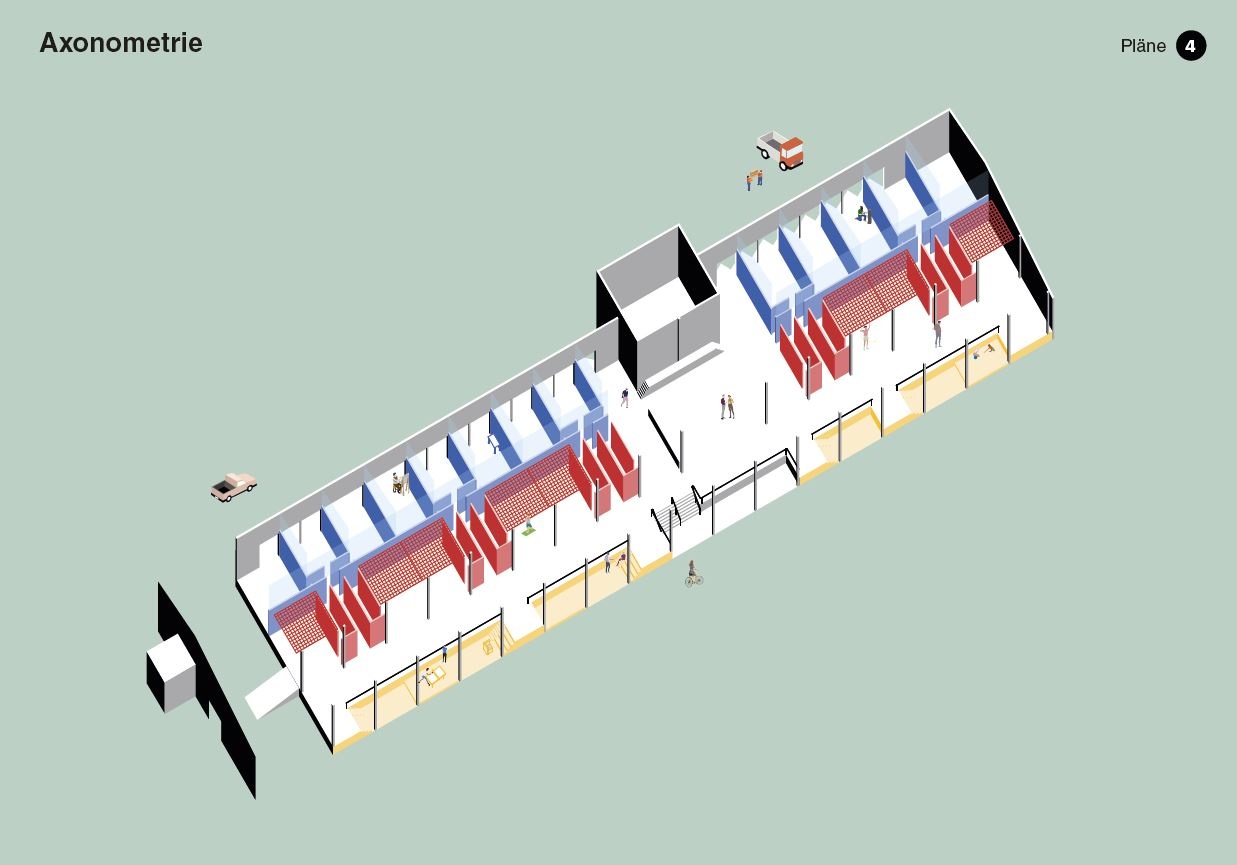 - Aufteilung der Halle nach Nutzungsarten und Öffentlichkeitsorientierung