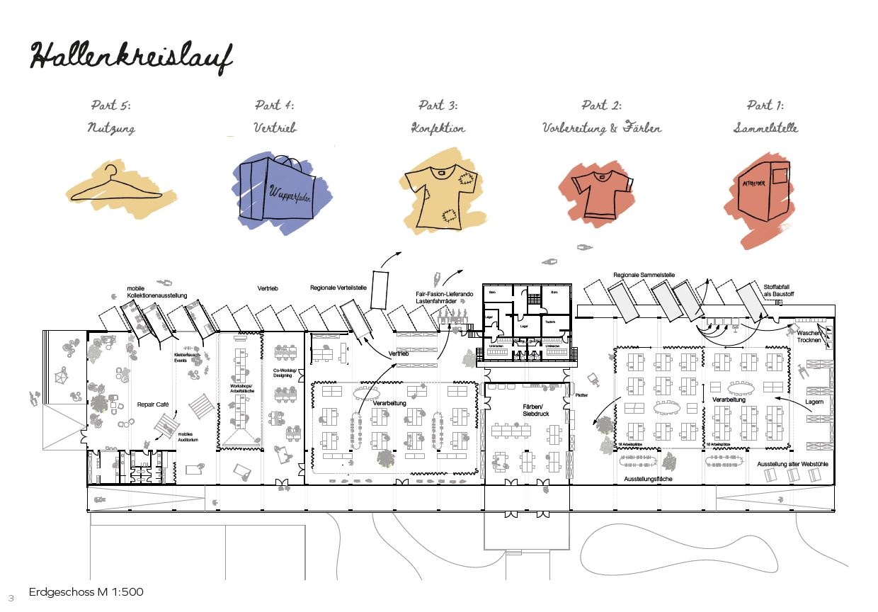 Im Konzept ist eine spannende Vision ausgearbeitet, welche die gesamte Fläche der Speditionshalle zu einem Recyclingkreislauf für alte Textilien umgestaltet. Der Grundriss der Speditionshalle wird hierfür nach den Abläufen und Aspekten des Textilkreislaufes geordnet, welche fließend ineinander übergehen. Das Konzept sieht einen zu 2/3 wirtschaftlich genutzten Bereich und einen zu 1/3 öffentlich genutzten Bereich für Up-Cycling Workshops, Veranstaltungen und Ausstellungen, vor.